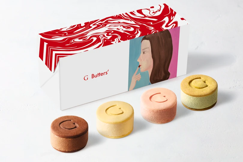 華やかな色味の缶は、Gバターズを象徴する女の子の絵をあしらいました。紅白の明るい色味に、不思議な雰囲気のデザインが、魅惑的なGバターズの世界観を表します。