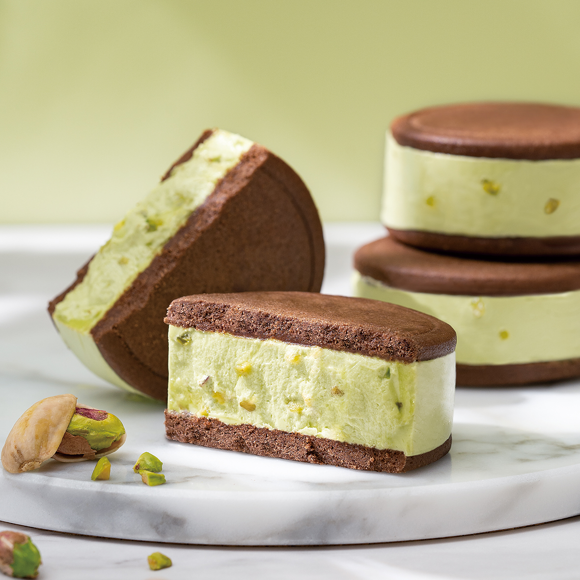 ピスタチオペーストも厳選し、香ばしくローストされた風味豊かなあじわいで、色鮮やかなピスタチオナッツとココアクッキーの食感を楽しんで頂けます。