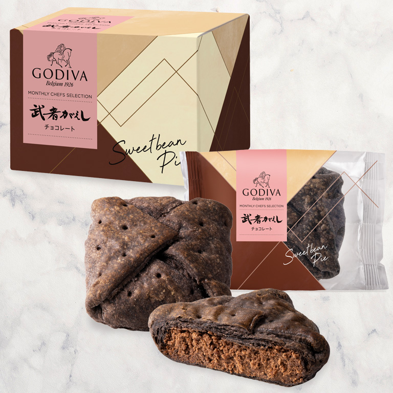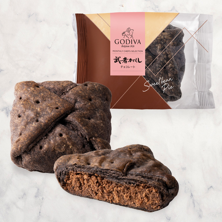 豆の皮を剥いで練り上げるまろやかなあずき餡に濃厚なベルギー産72%のチョコレートを合わせ、手仕事で256層に折るココアパイで包み焼成しました。