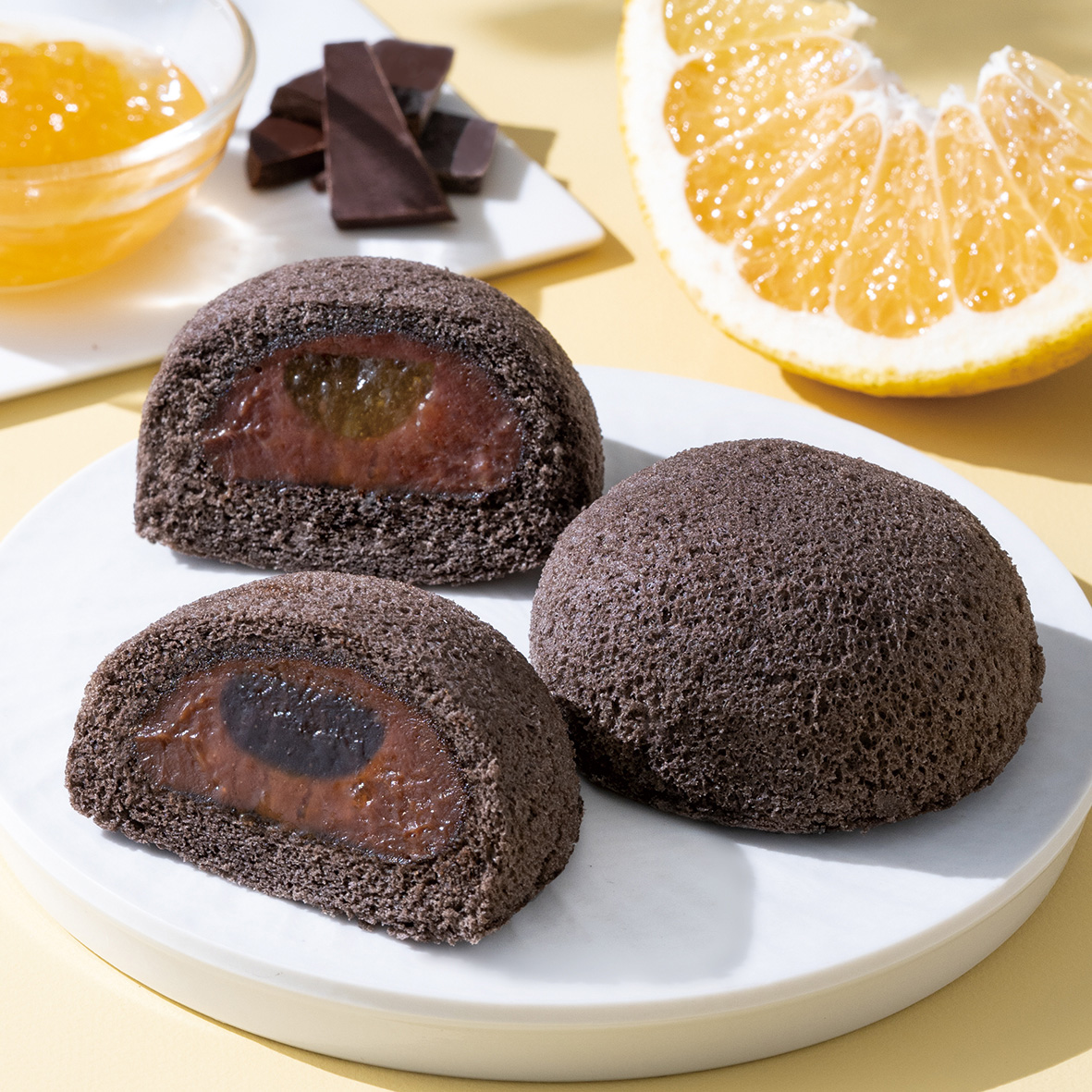 カカオ分73%のベルギー産ダークチョコレートを使用したチョコレートクリームに、ダークチョコレートガナッシュを重ねた、濃厚な味わいがたまらない“ダークチョコレートガナッシュ”と、 山口県産夏みかんのジャムを重ねた、爽やかな柑橘の香りと味わいが楽しめる“夏みかん&チョコレート”の2種類をご用意しました。