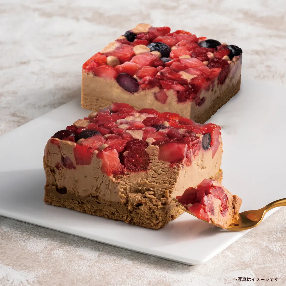 チョコレートの味わいをしっかり感じるビスキュイサッシェ*にリコッタ、クリームチーズ、ベルギー産チョコレート、ピスタチオナッツを合わせたなめらかなクリーム生地を重ね、ストロベリー、ブルーベリー、ラズベリーを華やかにトッピングしました。