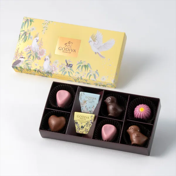 2026年春限定コレクション。春らしい色とりどりの花と羽ばたく鳥を表現したパッケージに、心躍るチョコレートと限定のカレを詰め合わせました。
