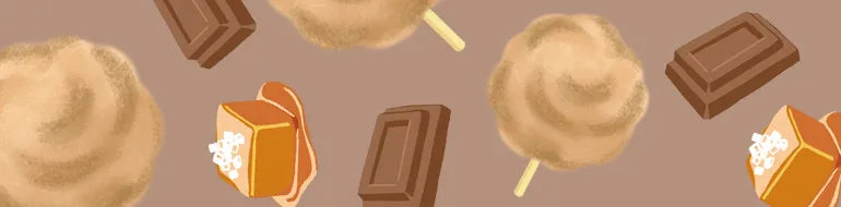 カカオパウダーとキャラメルパウダーを合わせたひと口サイズのふわふわのわたあめにほろ苦いカカオ分70%の削ったダークチョコレートをトッピング。