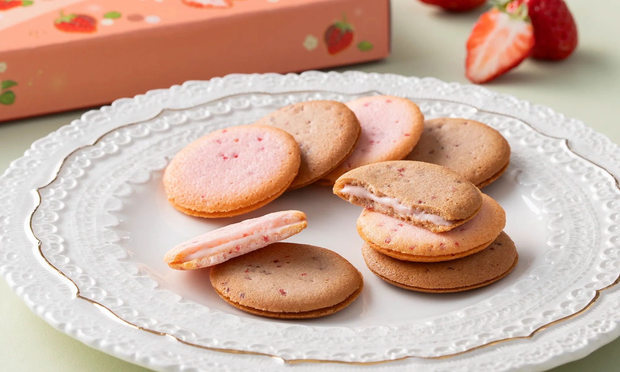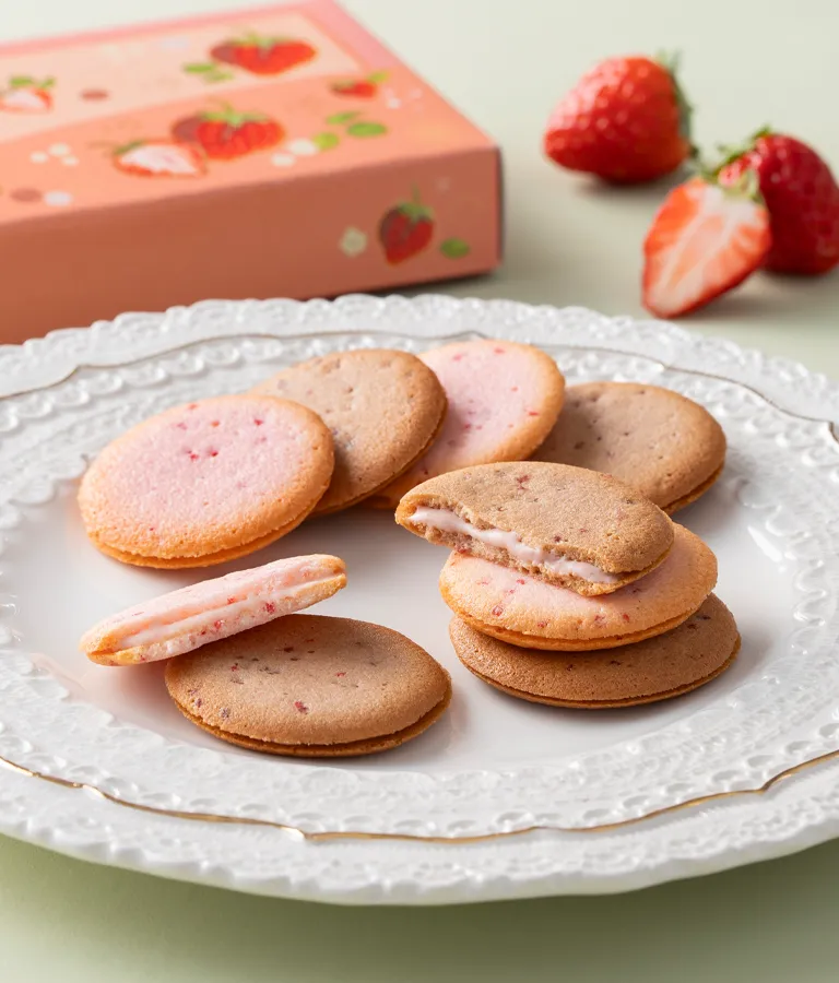 甘酸っぱい苺の香りが溶け込んだホワイトチョコレートガナッシュをサクっとしたサブレでサンドしました。優しい甘さのホワイトチョコレートと甘酸っぱい苺の絶妙なバランスです。